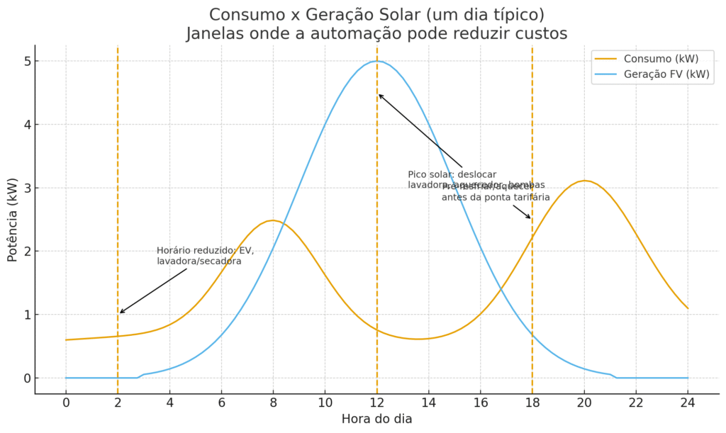 - Agendas: definir janelas para bombas, lavanderia, recarga de EV; failsafe para cargas críticas.