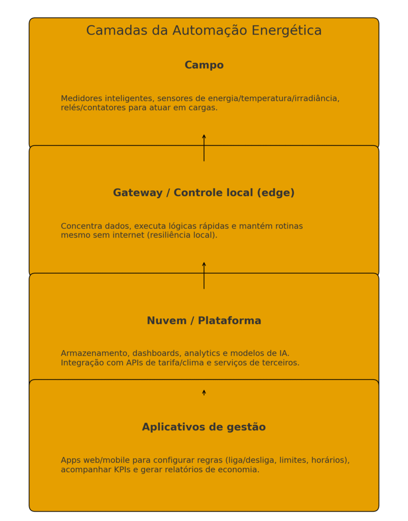 - Campo — Medidores inteligentes, sensores de energia/temperatura/irradiância e relés/contatores para atuar em cargas.