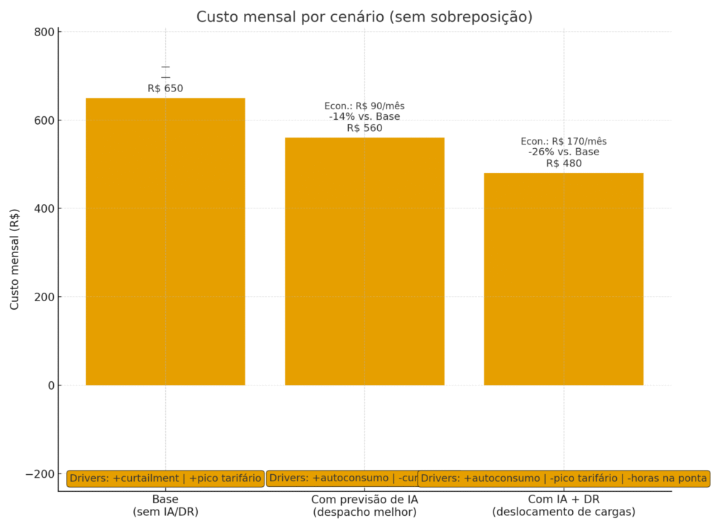 - Exemplo de cálculo (metodologia, não números fixos): cenário base x cenário com automação+IA+FV por 12–24 meses.