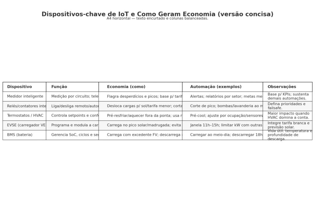 Revisões sistemáticas de “smart buildings” apontam que, quando bem implementada, a IoT pode entregar reduções de consumo em torno de até ~30% e queda de OPEX próxima de ~20% — números que variam por caso, pois dependem do clima, das cargas, da aderência operacional e da qualidade da automação. O ponto central é o método: medir (baseline), intervir (regras e setpoints), monitorar KPIs (kWh, pico de demanda, fator de autoconsumo) e ajustar continuamente. Assim, a economia deixa de ser pontual e vira um ciclo de melhoria. - Integração com fotovoltaico (FV) e baterias.