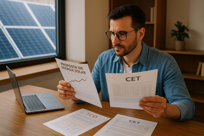 Centralize a análise no TCO (custo total de propriedade) usando faixas em vez de valores únicos: CAPEX (equipamentos, montagem, homologação) e OPEX (O&M, monitoramento, seguros quando aplicável). Para cada item, preencha mín–provável–máx e registre o que está e não está incluído no escopo. Faça o mesmo para tarifas de energia (sem travar um número): trabalhe com cenários de tarifa neutra, mais alta e mais baixa. Isso evita otimismos involuntários e deixa explícitas as margens de variação. Se preferir, use a planilha pronta do blog: Modelo_TCO_Energia_Sollar.xlsx.