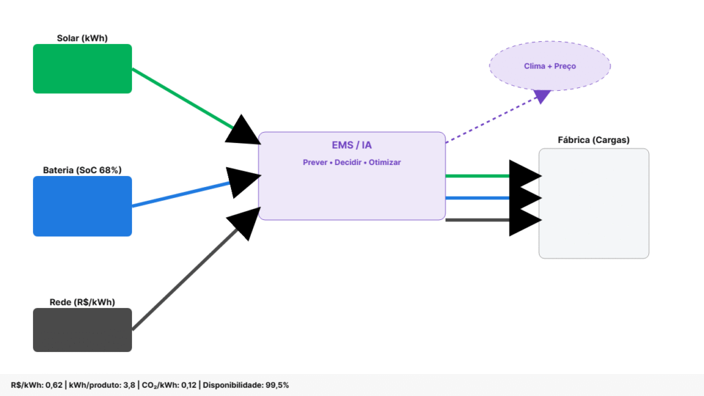 Painéis fotovoltaicos, inversores inteligentes e bancos de baterias formam uma “miniusina” no próprio site. A fábrica consome o que produz, guarda excedentes e, com a IA, escolhe a melhor hora para carregar ou descarregar, comprando menos energia cara na ponta e reduzindo a exposição a oscilações da rede.