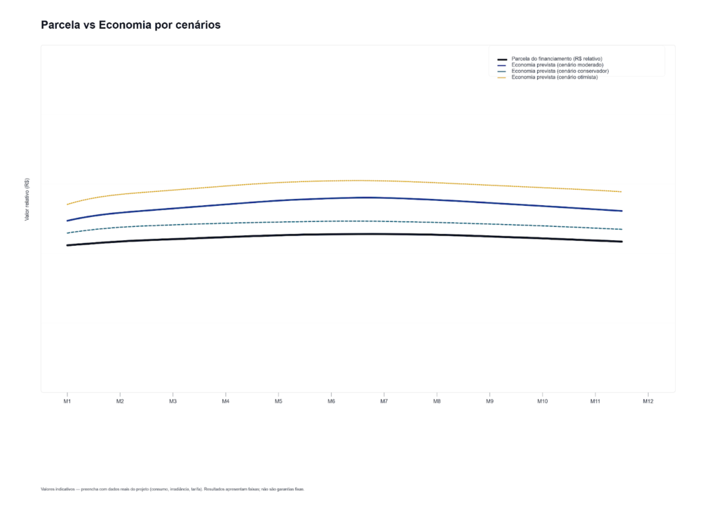 A forma mais prática de avaliar compatibilidade é simples: comparar a parcela mensal com a faixa estimada de economia do sistema.