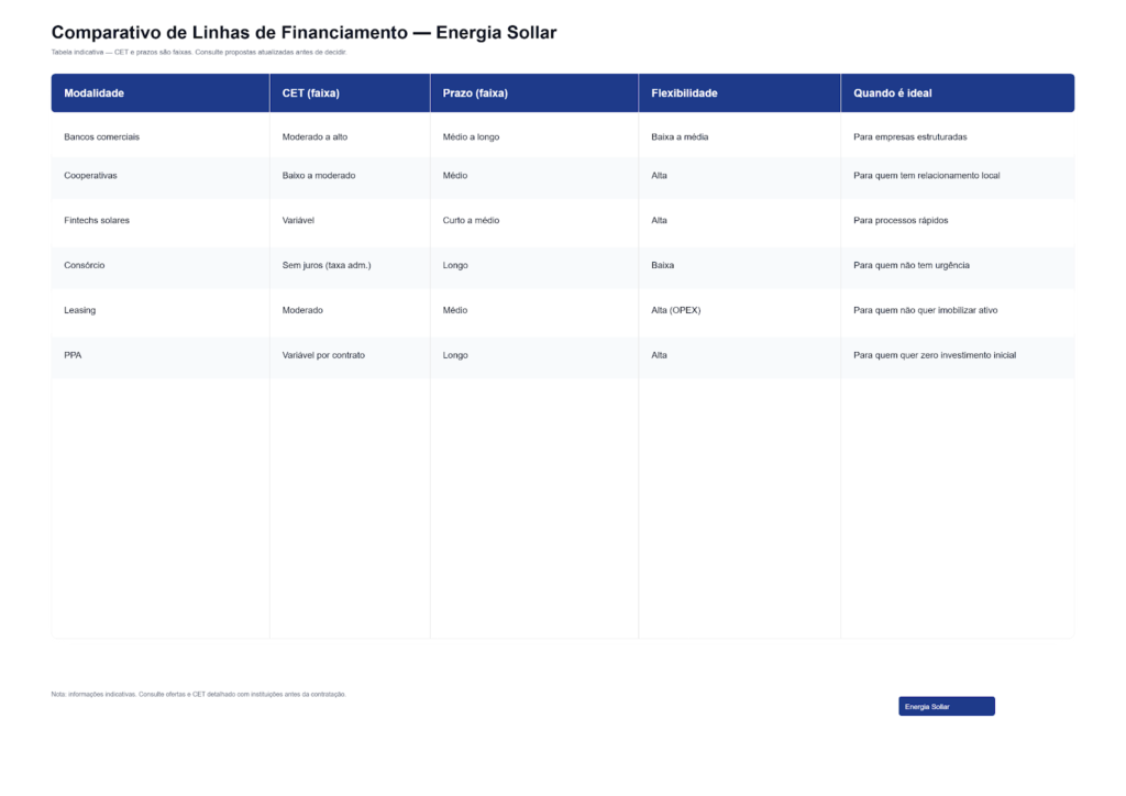 Selecionar a modalidade correta de financiamento é um dos fatores que mais influenciam na capacidade do sistema solar gerar fluxo positivo ao longo do tempo. Cada instituição oferece condições, prazos, exigências e custos diferentes — e entender essas diferenças permite que o empresário alinhe investimento, risco e previsibilidade financeira. O objetivo não é apenas pagar parcelas acessíveis, mas equilibrar economia, prazo e custo total para formar uma estrutura sustentável.