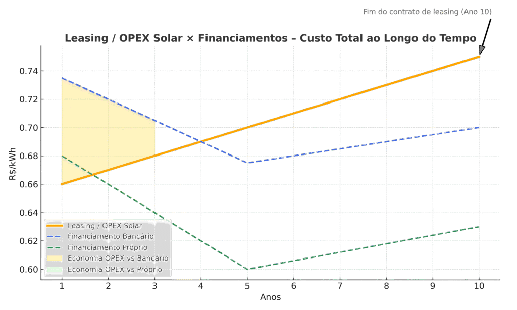 - Negócios que priorizam caixa (OPEX > CAPEX). Se o foco é preservar capital de giro e manter limites bancários livres para o core do negócio, a locação operacional transforma a energia em serviço mensal previsível. Você evita desembolso inicial alto e ainda ganha visibilidade orçamentária para o período contratual.